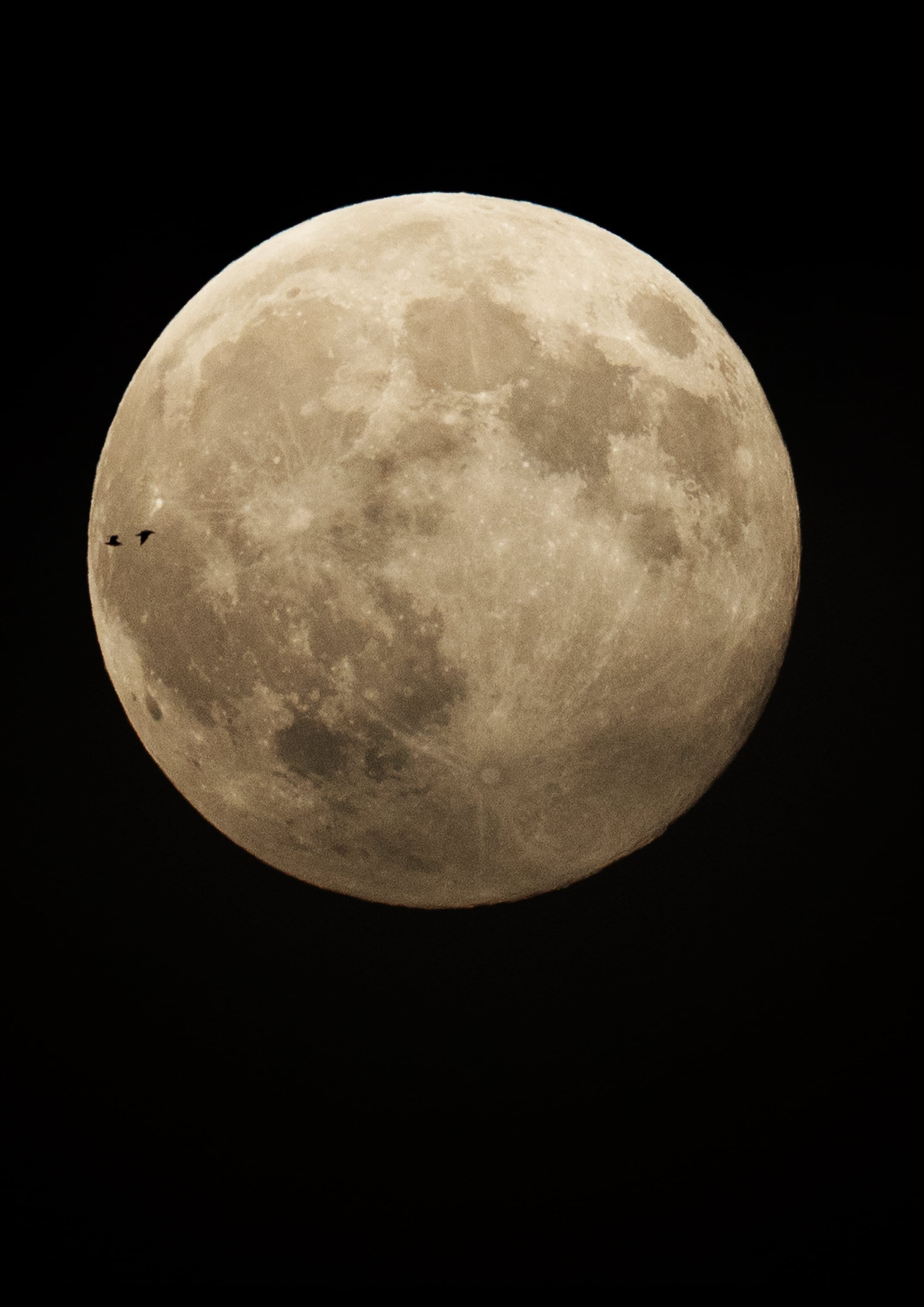 寒い寒いと言いながら外で眺めてたら、月の中を鳥達が飛んでた。